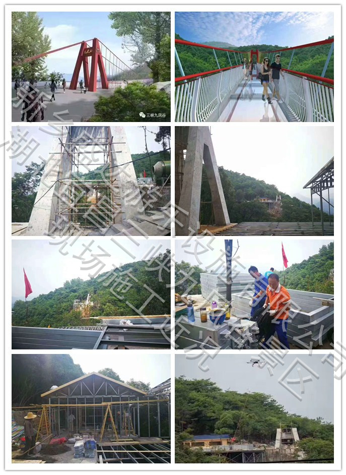 湖北宜昌三峡九凤谷景区玻璃吊桥,桥长117m,桥面宽:2.8m,净宽2.4m,玻璃尺寸2mX2m!设计荷载:人群荷载标准值3.5KN/m²。